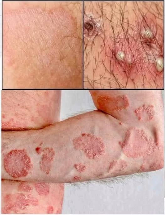 • Red, scaly patches with raised edges