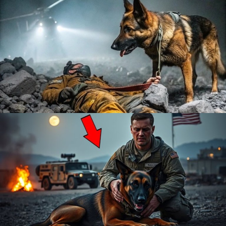 A rescue team quickly assembled, led entirely by the wounded yet relentless dog. Ghost guided them safely, expertly detecting hidden explosives, clearing paths until they found Logan, barely alive but still breathing, clutching tightly the torn harness from Ghost’s uniform.