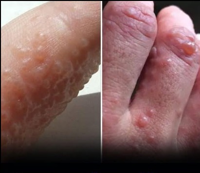 - Deep-set blisters on hands and feet (specifically on the edges of the fingers, toes, palms, and soles of the feet)